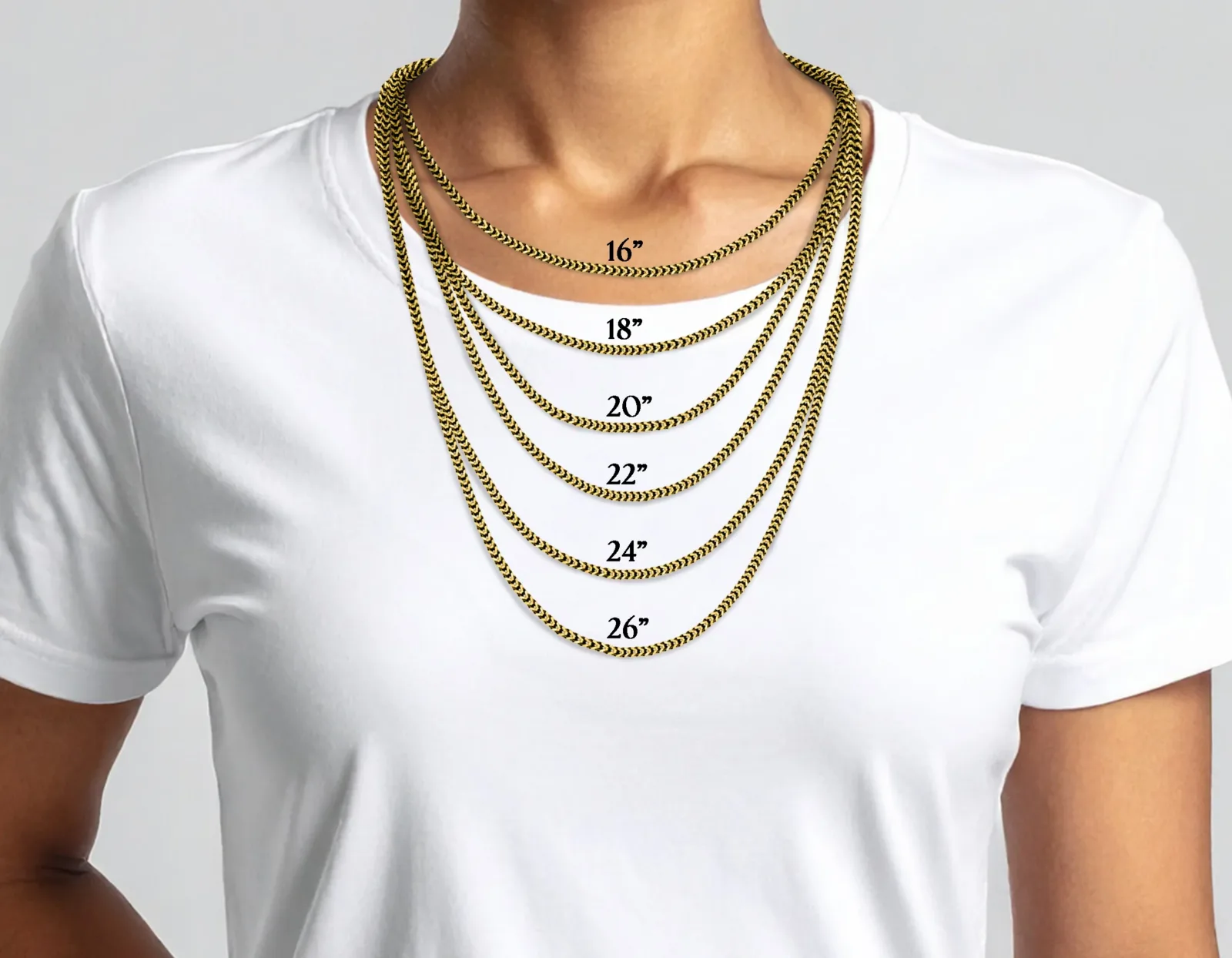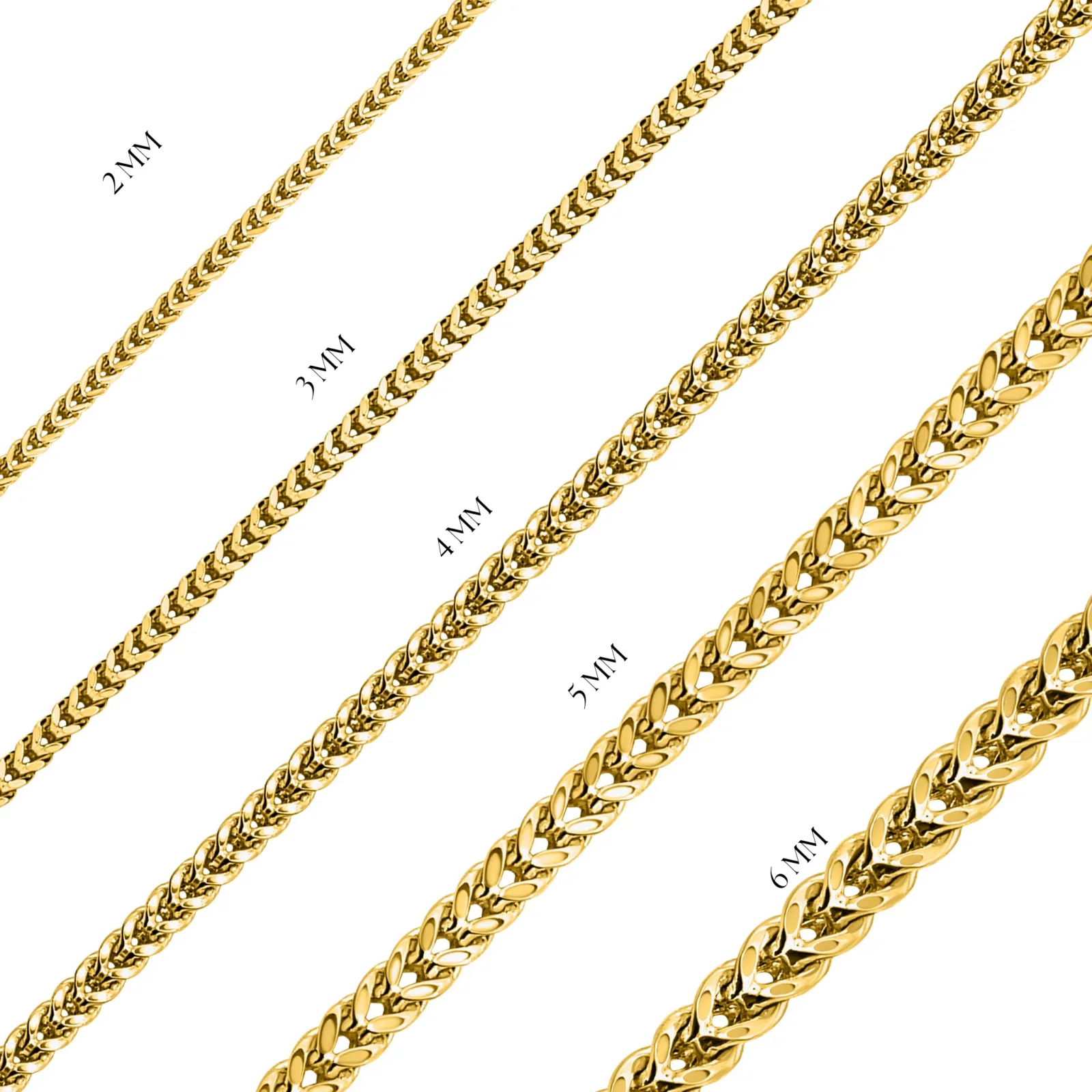 Classic 10K Yellow Gold Franco Link ChainSleek, strong, and refined — our 10K yellow gold Franco link chain offers a modern twist on traditional gold. Its tightly woven links create a clean, square profile that’s both flexible and durable. Available in 2mm, 3mm, 4mm, 5mm and 6mm, this chain is ideal for everyday wear or layering with pendants. Choose your perfect length: 16″, 18″, 20″, 22″, 24″, or 26″ to match your personal style. Crafted in10K gold Available in 2mm to 6mm thickness Length options: 16″ to 26″ Known for its durability and smooth, modern look Perfect for wearing solo or paired with a charm or pendant Whether you’re dressing it up or down, this Franco chain brings luxury and versatility to your collection. Disclaimer: All measurements, including thickness and length, are approximate and may vary slightly due to the nature of handcrafted or custom-made jewelry. We strive to provide the most accurate dimensions possible, but minor variations may occur.