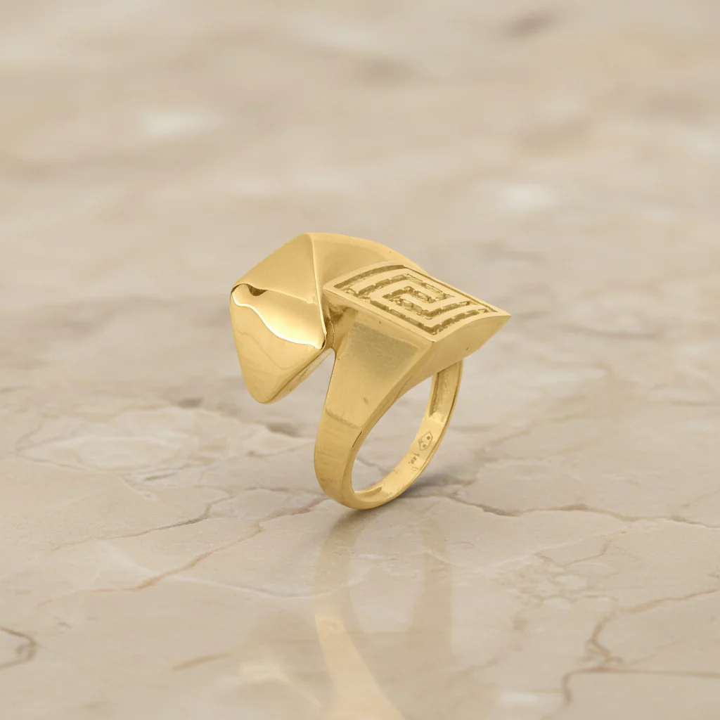 Anillo geométrico en oro 14K con patrón cuadrado tipo laberinto. Su estilo minimalista y original lo convierte en una pieza ideal para mujeres que buscan un look distintivo y moderno.