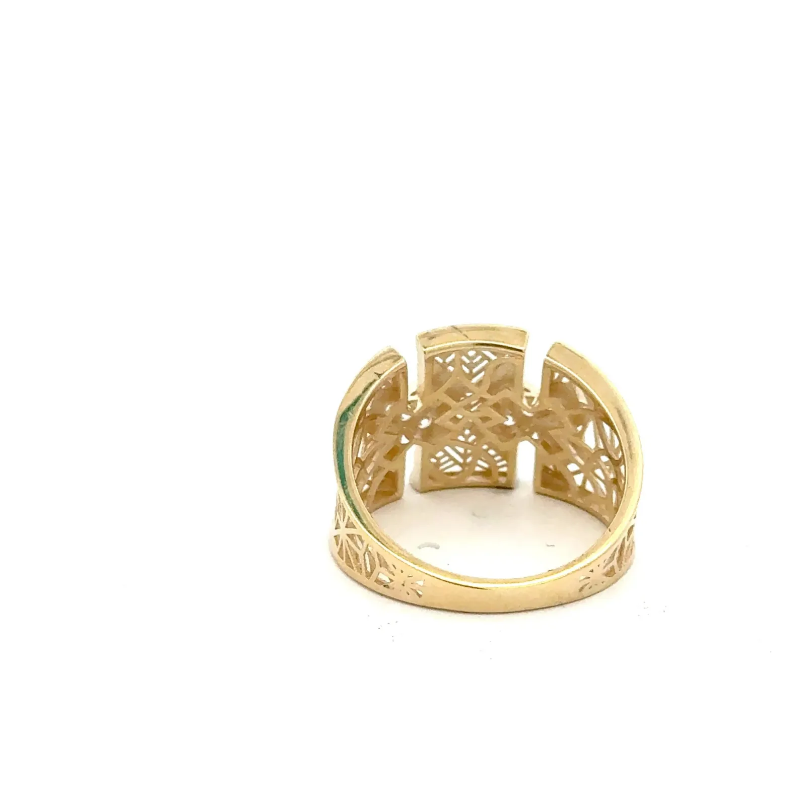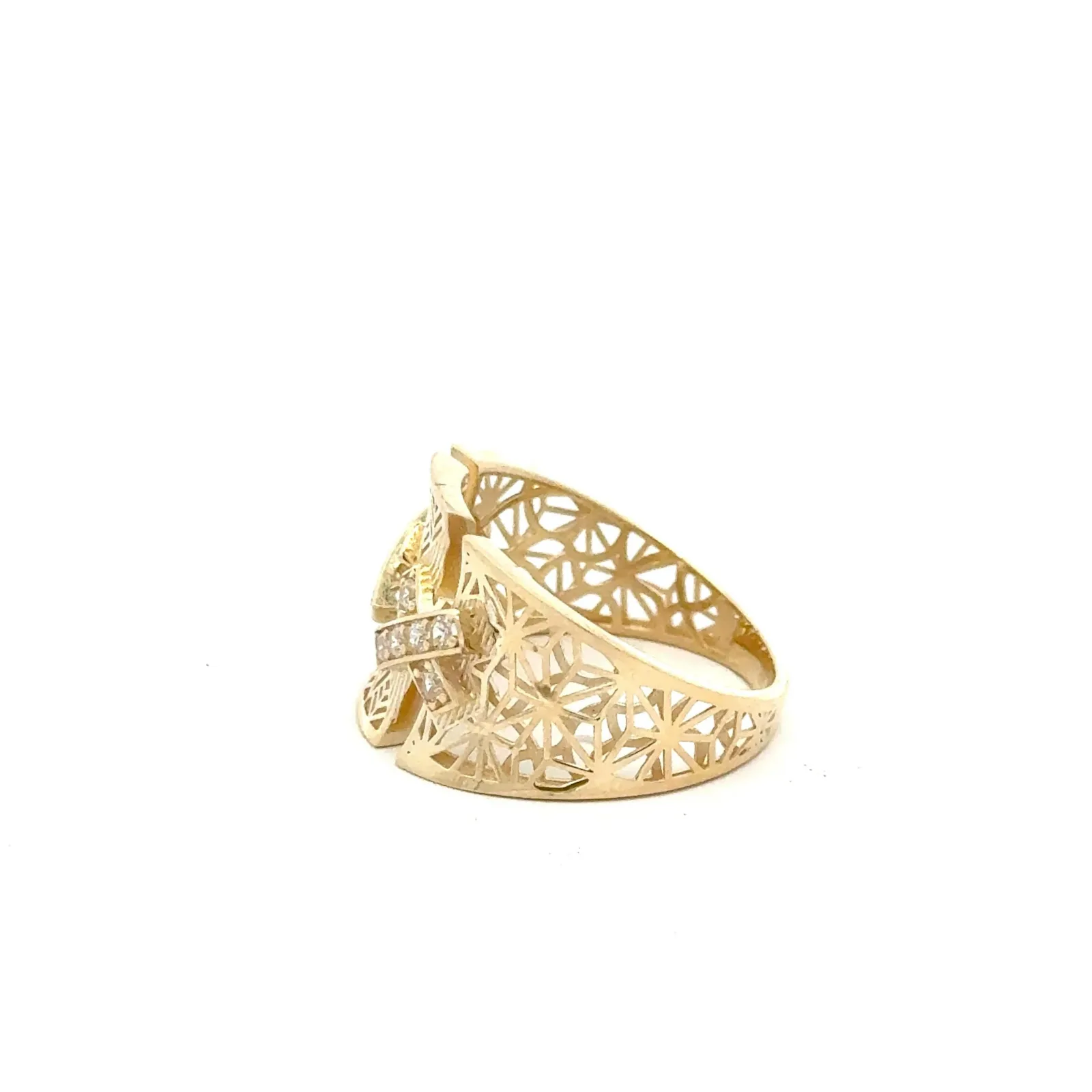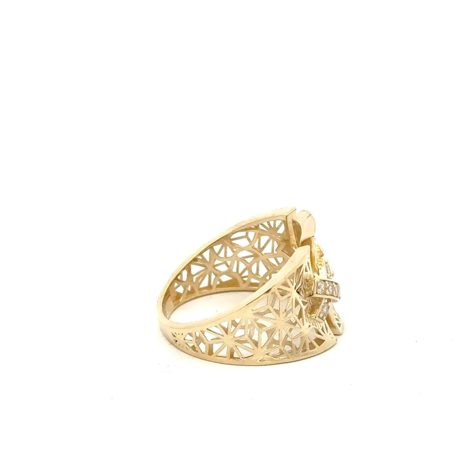 This stunning gold ring features intricate designs that catch the light beautifully. Adorned with sparkling accents, it adds a touch of elegance to any outfit. Perfect for special occasions or as a statement piece in your everyday jewelry collection.